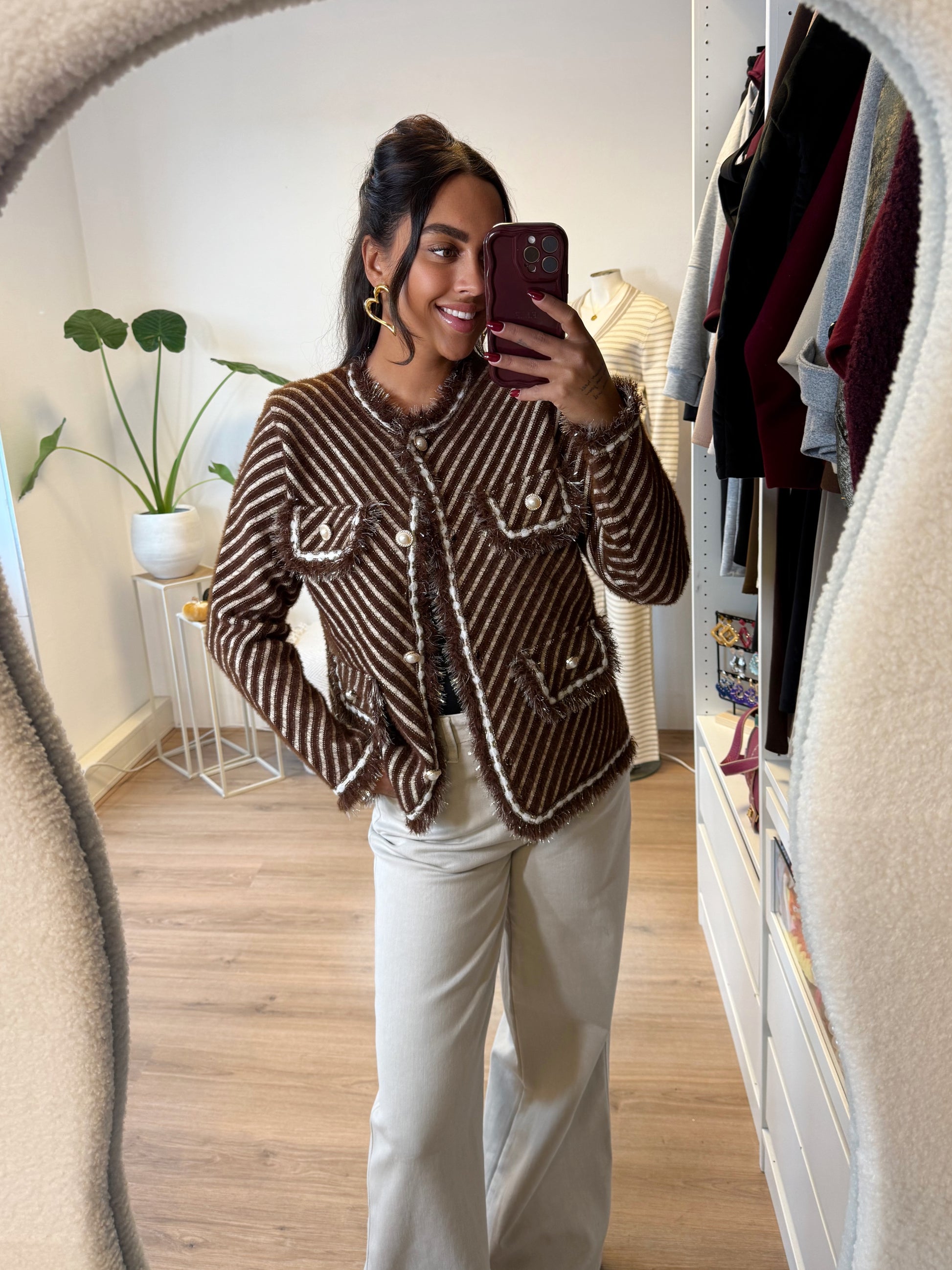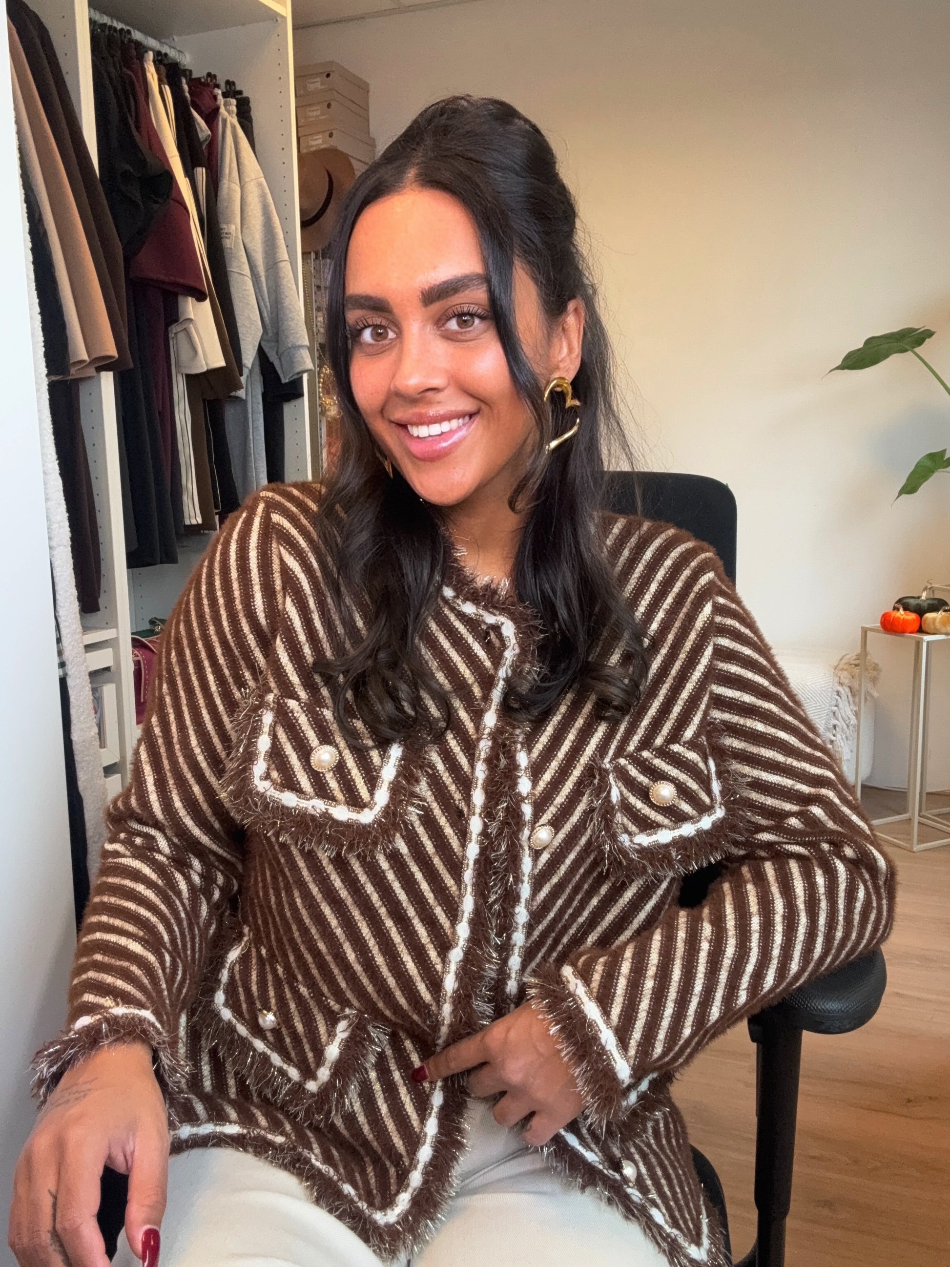 De combinatie van warme chocoladebruine tinten met frisse beige strepen maakt dit item tijdloos én chic – ideaal voor een dag op kantoor, een etentje of een stijlvolle casual look.