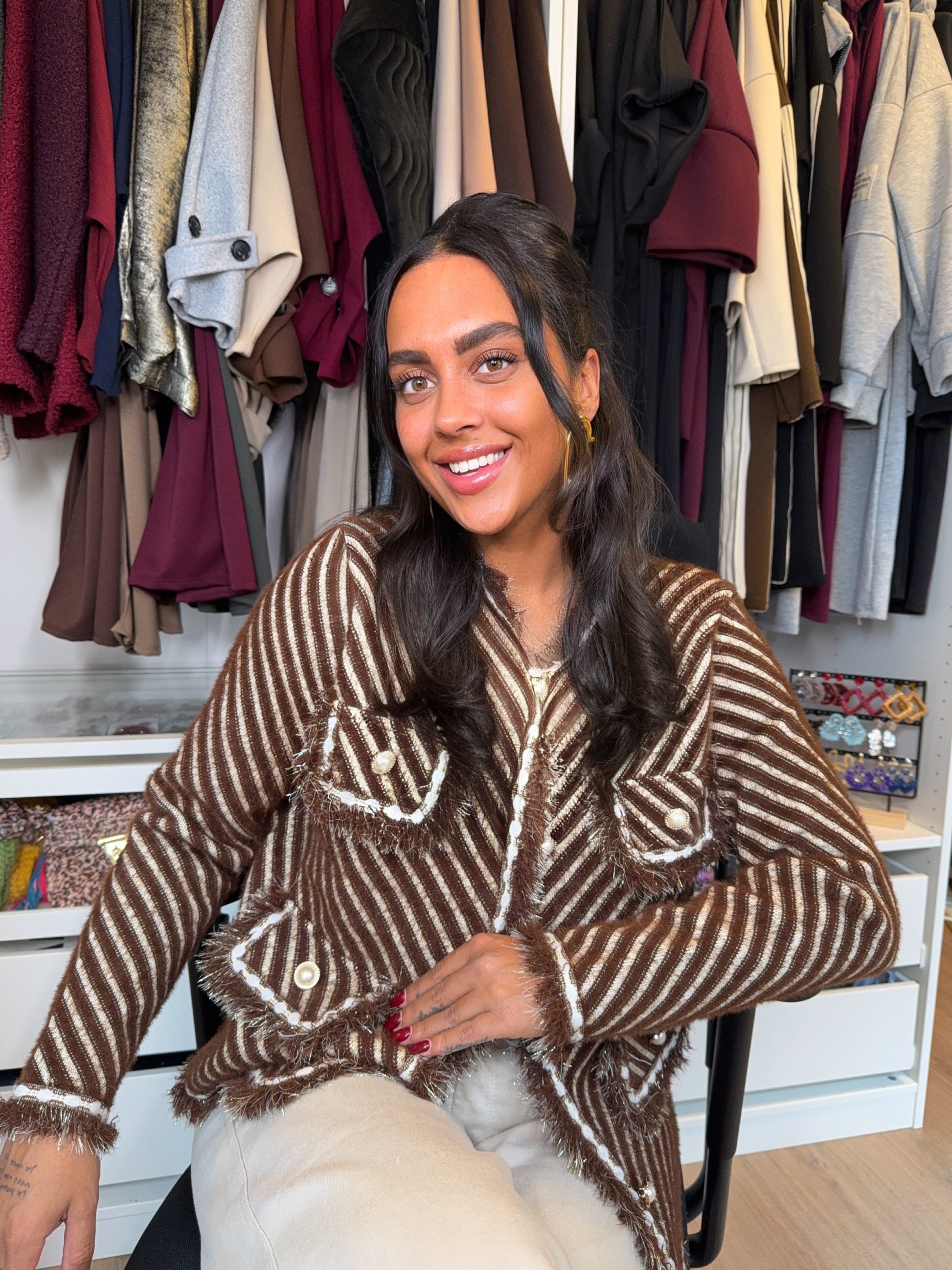 Laat je verleiden door de elegante charme van het Aurora Pearl Vest in een stijlvolle choco/beige kleurencombinatie. Dit vest straalt pure luxe uit dankzij de verfijnde parelknopen, subtiele gouden lurexdraad en de prachtige gestreepte print.