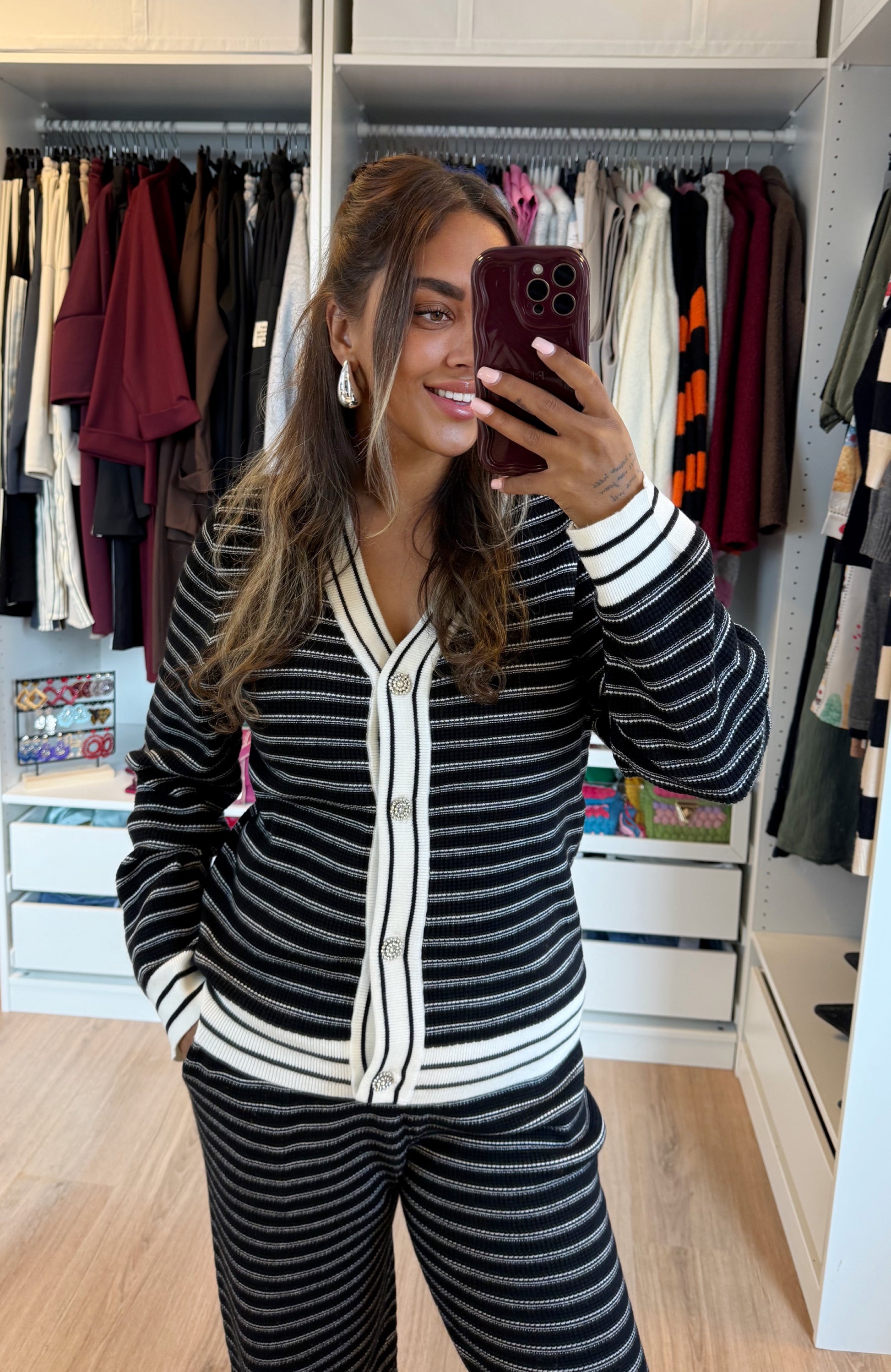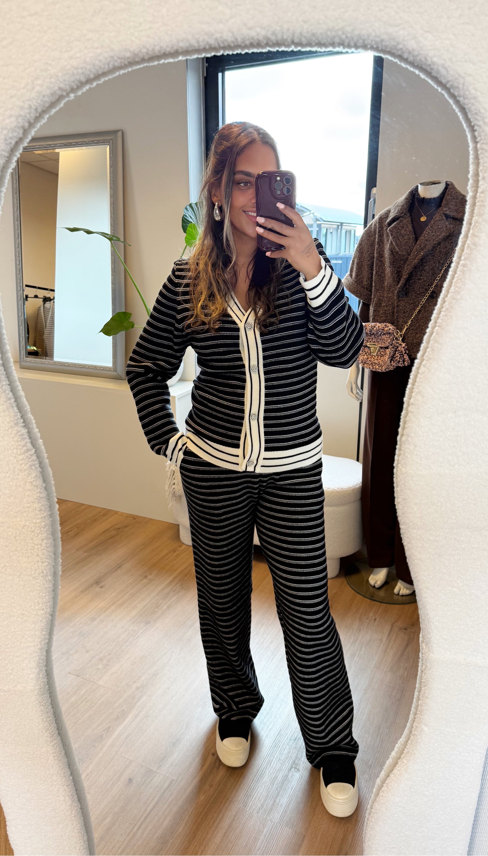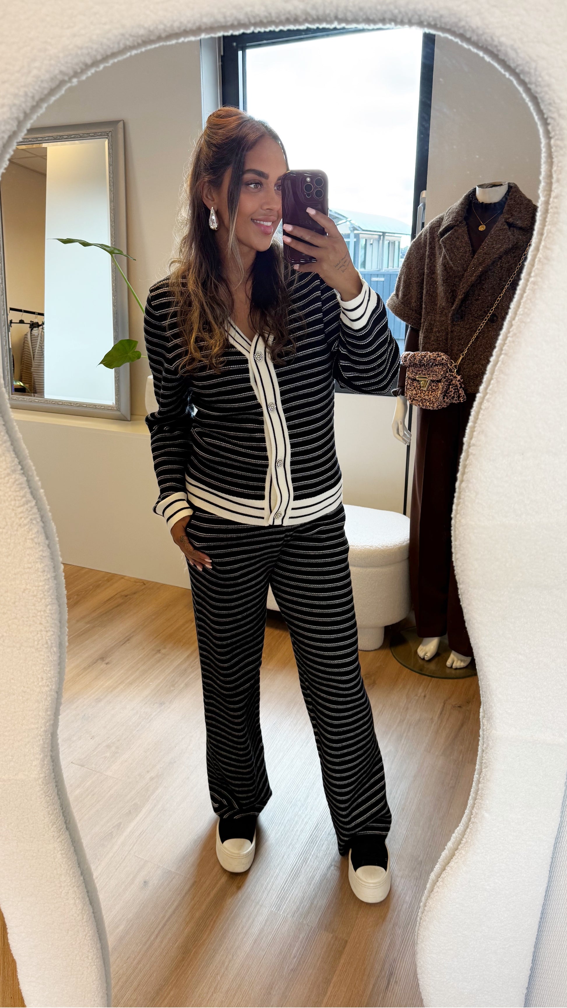 De set is gemaakt van een luxe, dikke ribbelstof die direct een chique uitstraling geeft. De broek heeft rechte pijpen en praktische zakken, waardoor comfort en stijl perfect samengaan. Het bijpassende vest/top is verfijnd afgewerkt met schitterende zilverkleurige knoopjes in de vorm van diamanten bloemen.
