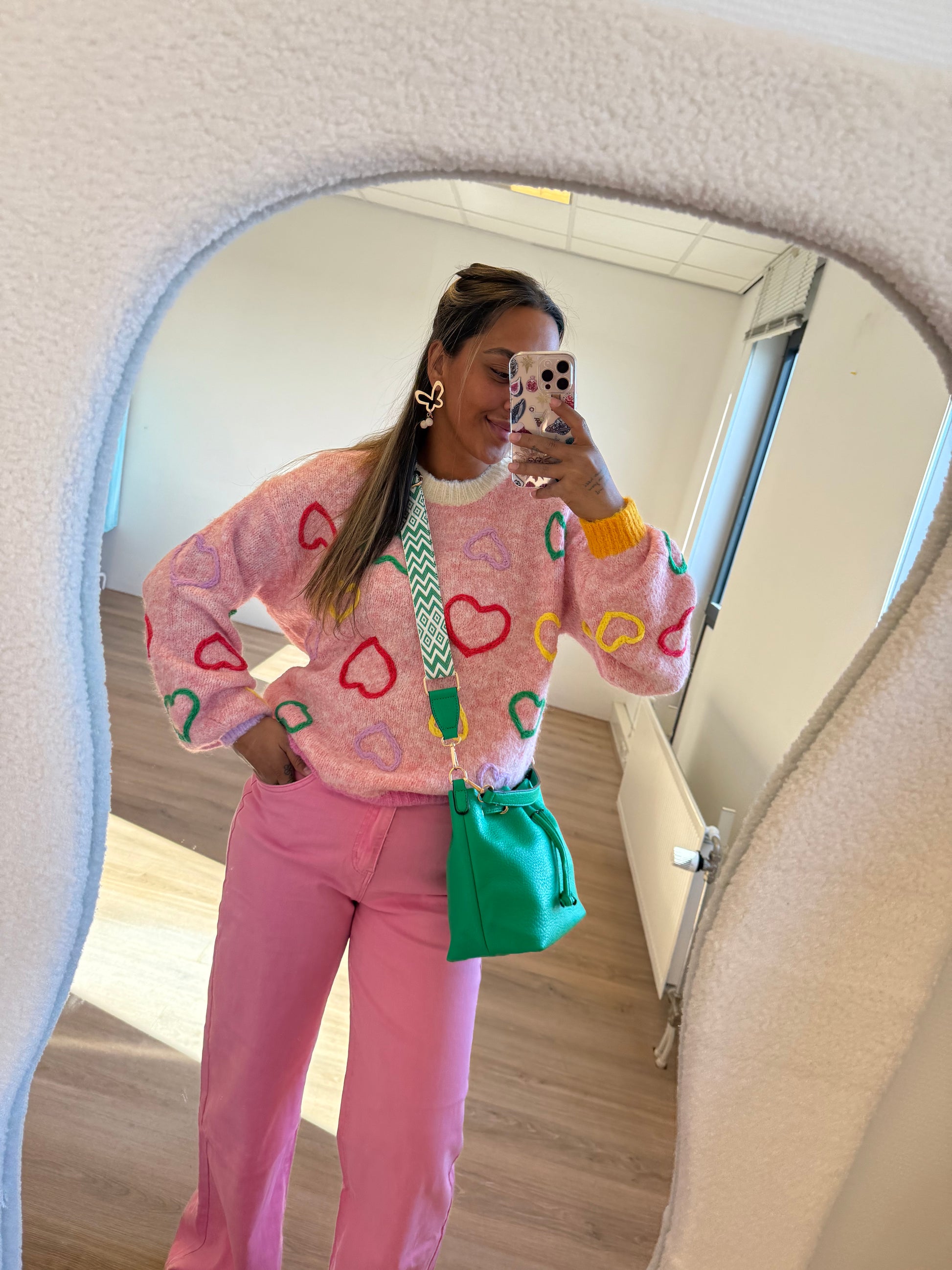 Deze knitted trui is een waar feestje β letterlijk π. Verkrijgbaar in lichtroze en lichtblauw, en bezaaid met vrolijke hartjes in de kleuren rood, geel, lila en groen. Alsof je je dag start met een glimlach π
