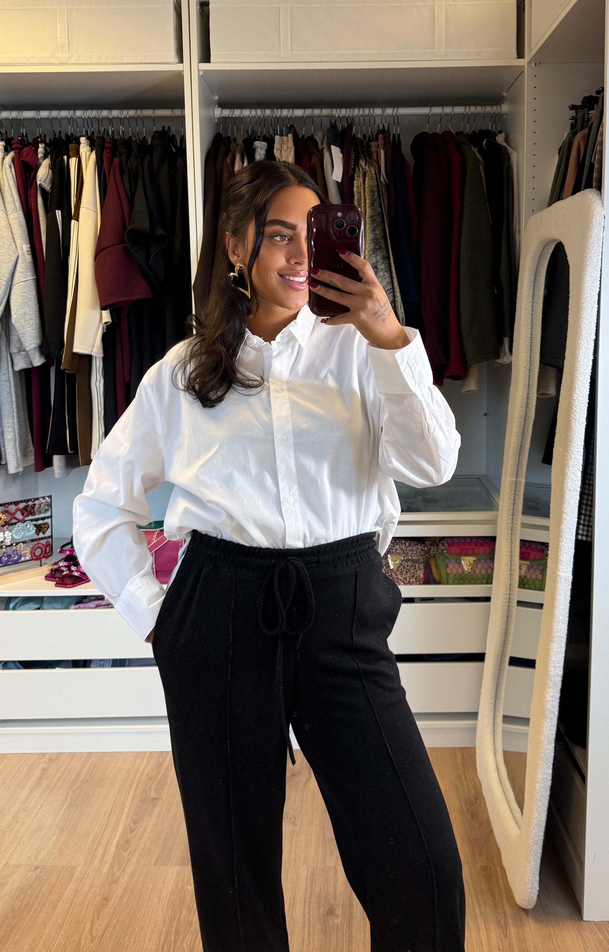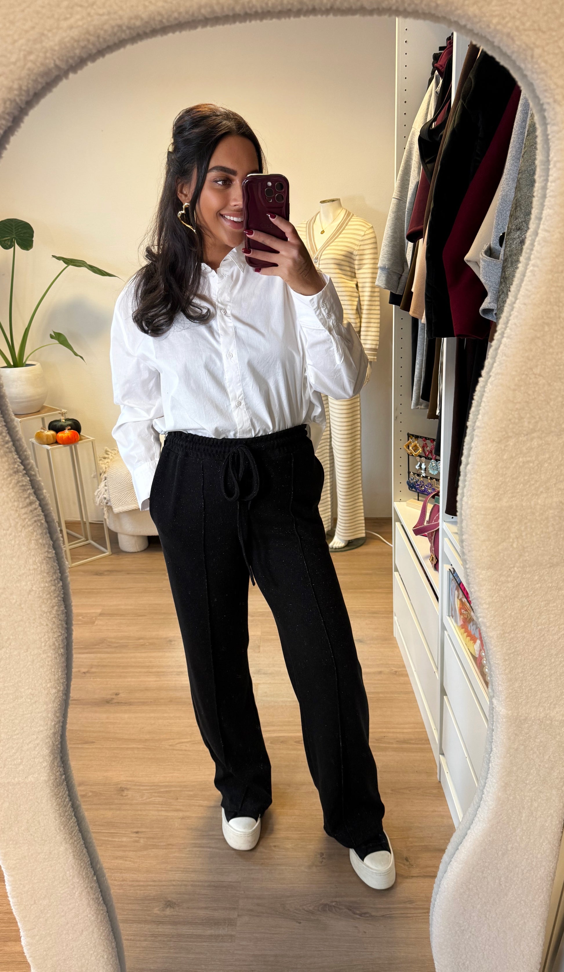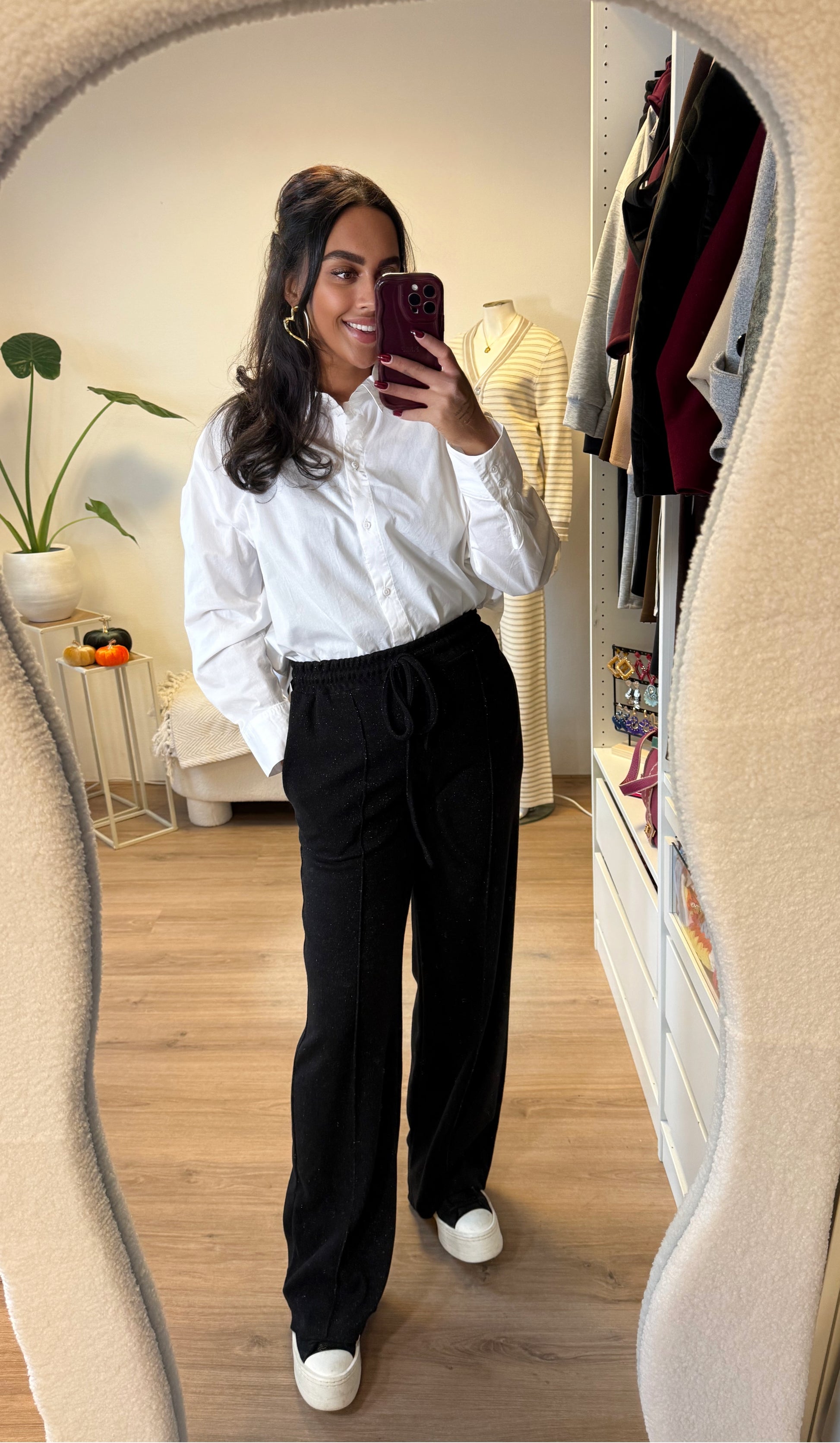Draag de Sophia Soft Glitter Jogger met een witte blouse voor een frisse, stijlvolle look, of combineer met een zachte knit voor een comfy-chic vibe. Voeg sneakers toe voor een casual uitstraling of hakken voor een classy office look. Slay the day op kantoor – en ga daarna door naar de borrel in stijl!