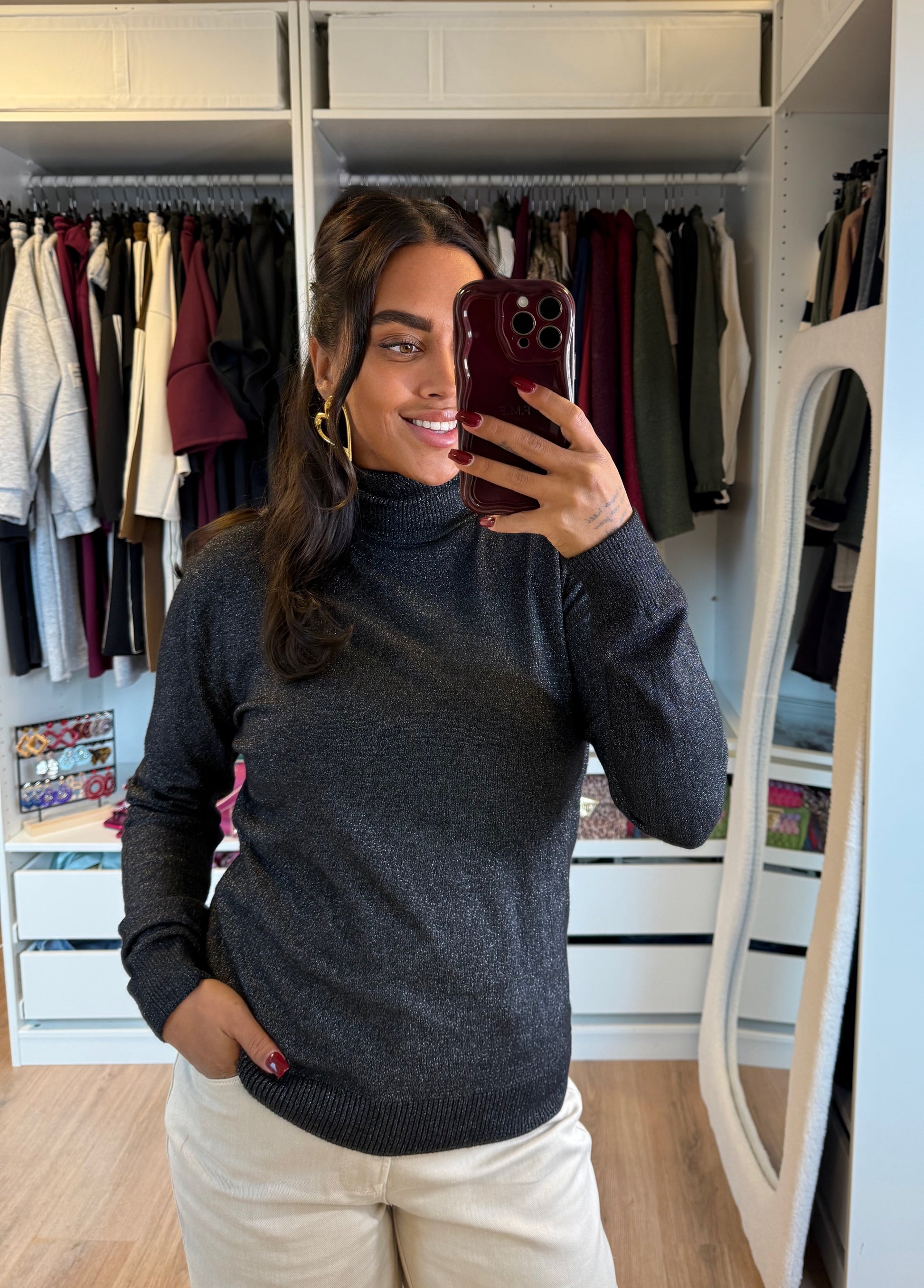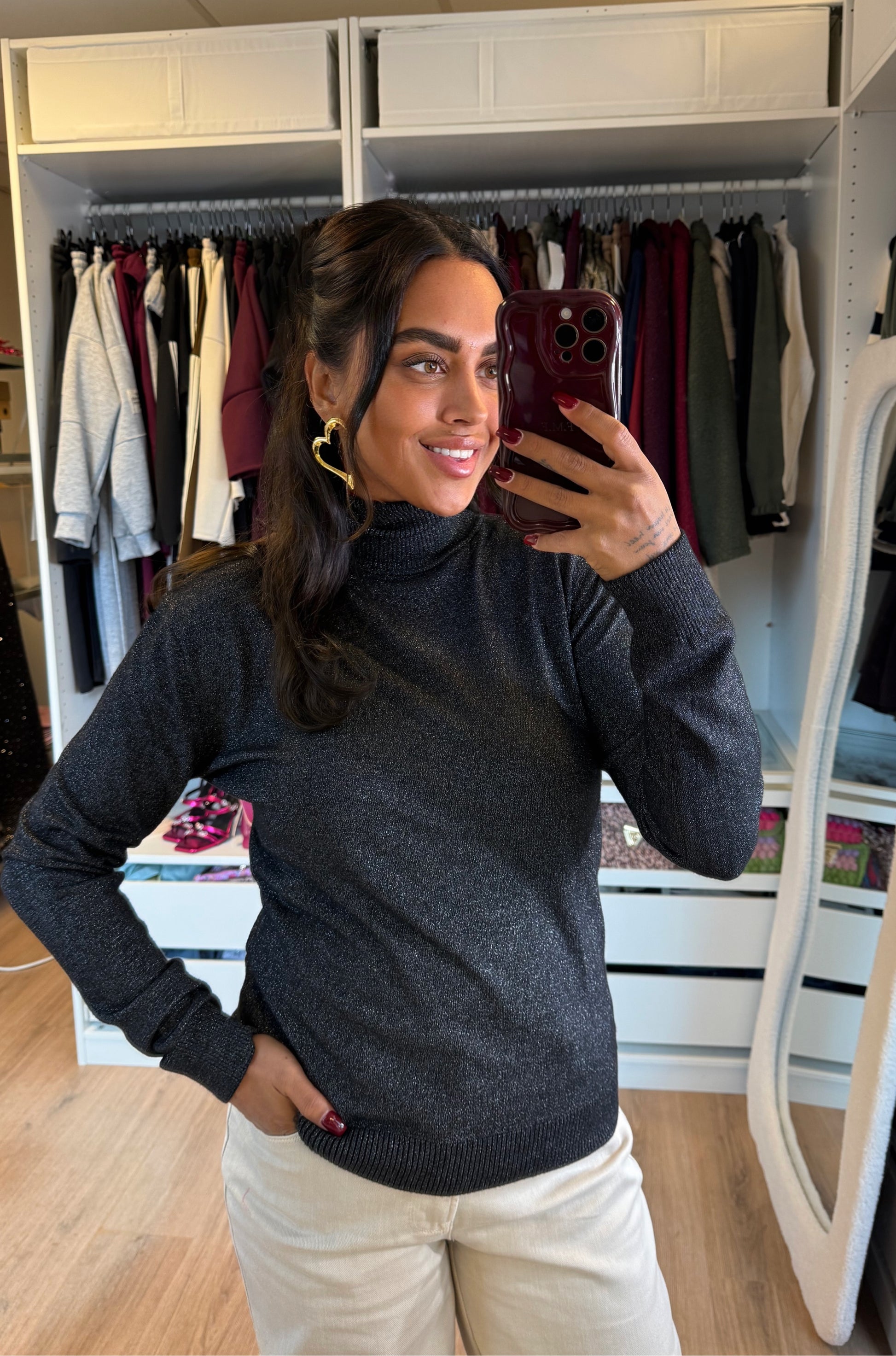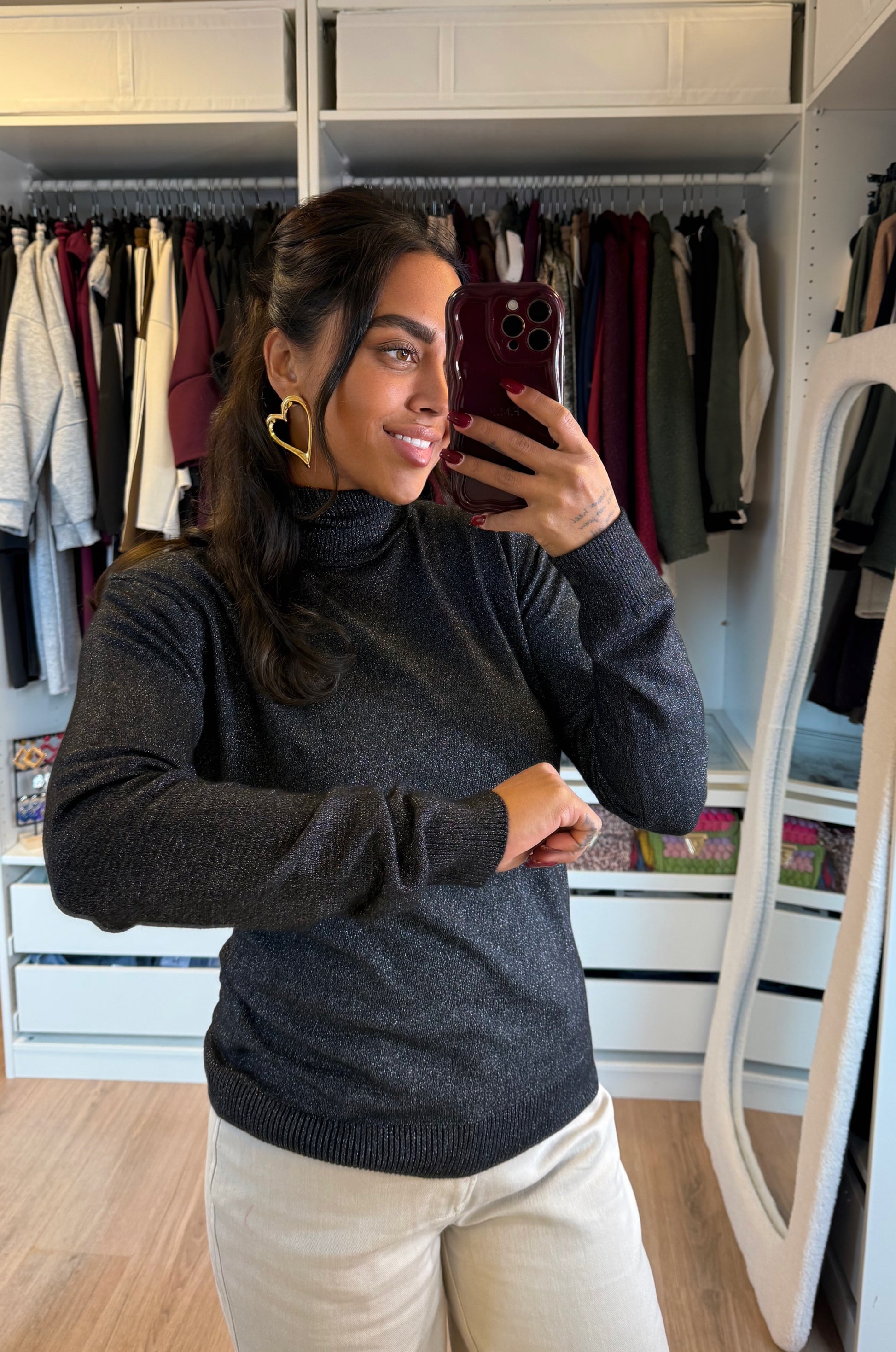 Combineer deze glitter col met een blazer voor een classy, chique look, of draag hem met onze straight fit jeans voor een stijlvolle, casual vibe. Voeg wat subtiele sieraden toe en laat de glitterdetails het werk doen — effortless en sophisticated.