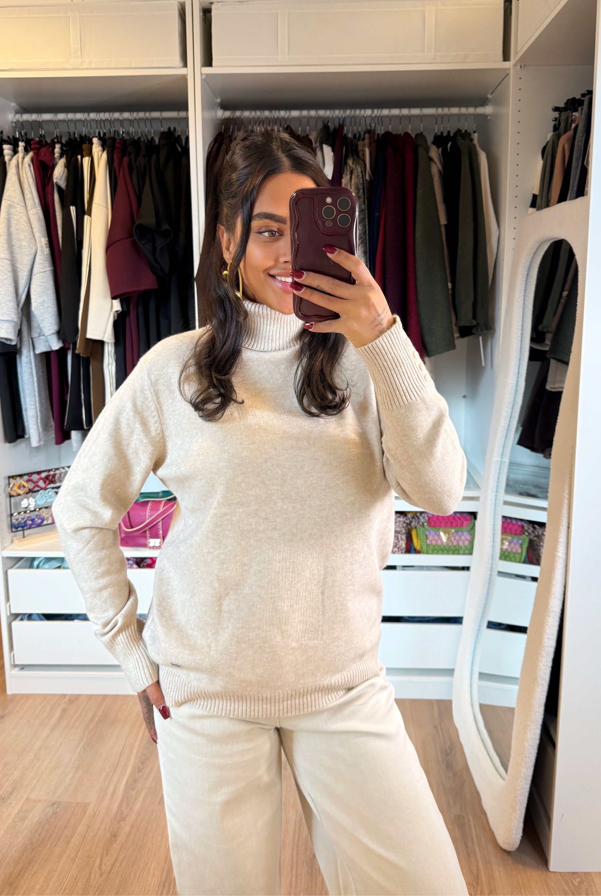 De afwerking van de mouwen met subtiele knoopdetails geeft een speelse, stijlvolle touch. Dankzij de neutrale beige kleur en tijdloze pasvorm kun je deze col combineren met elke jeans of pantalon – van casual tot chic.